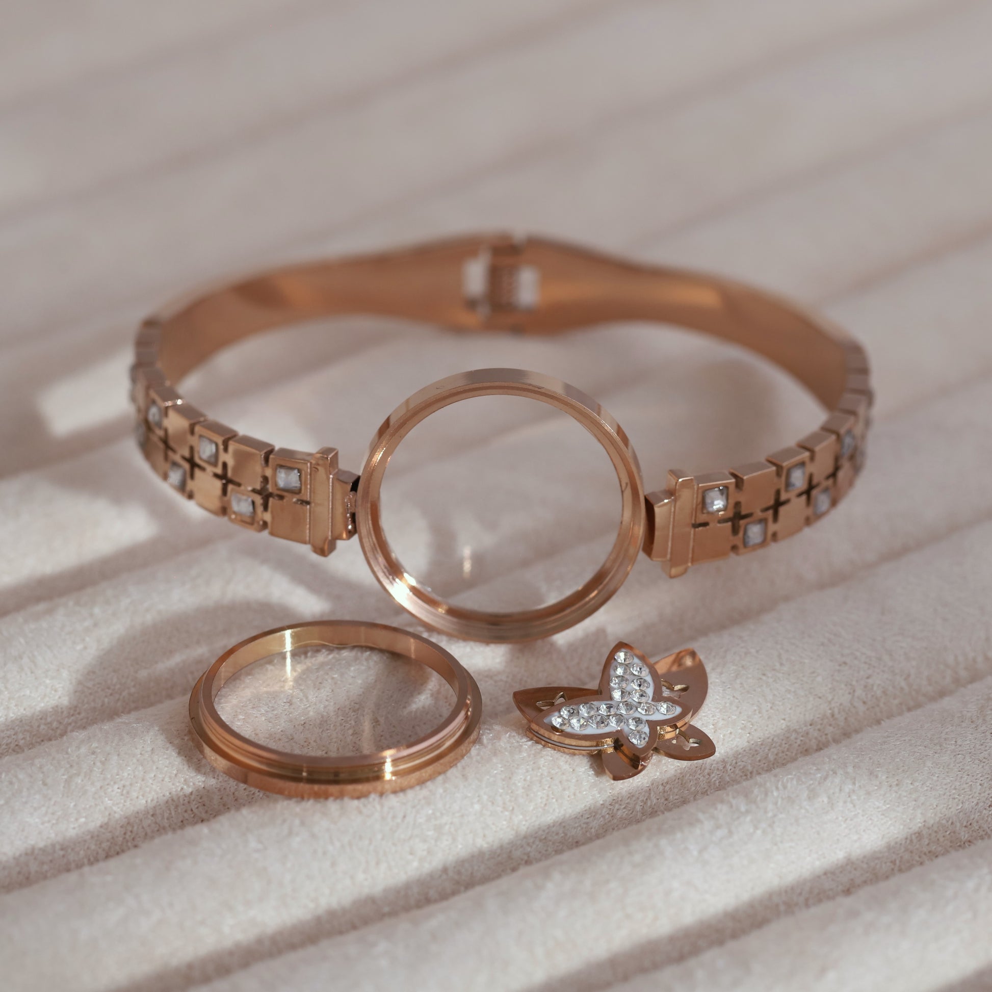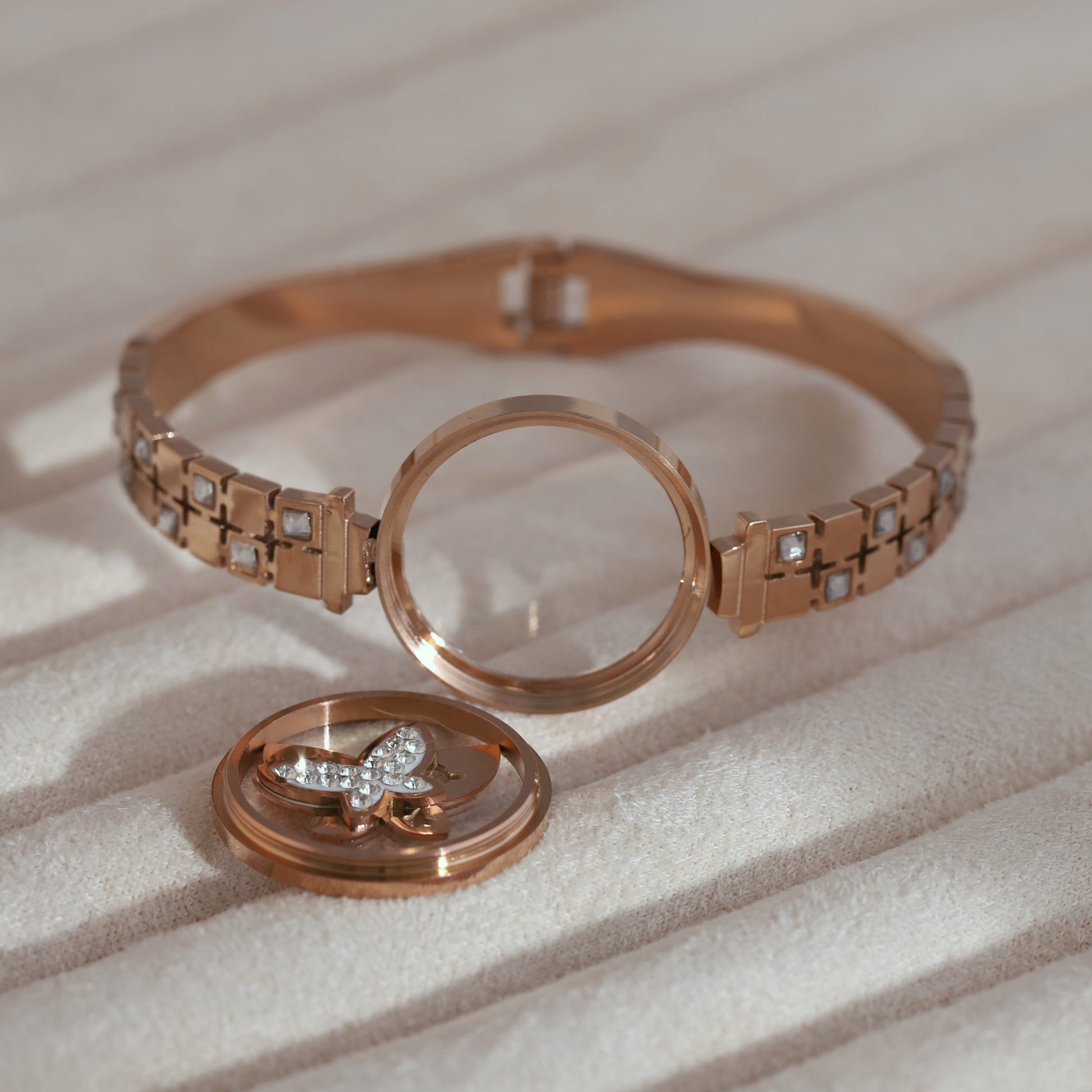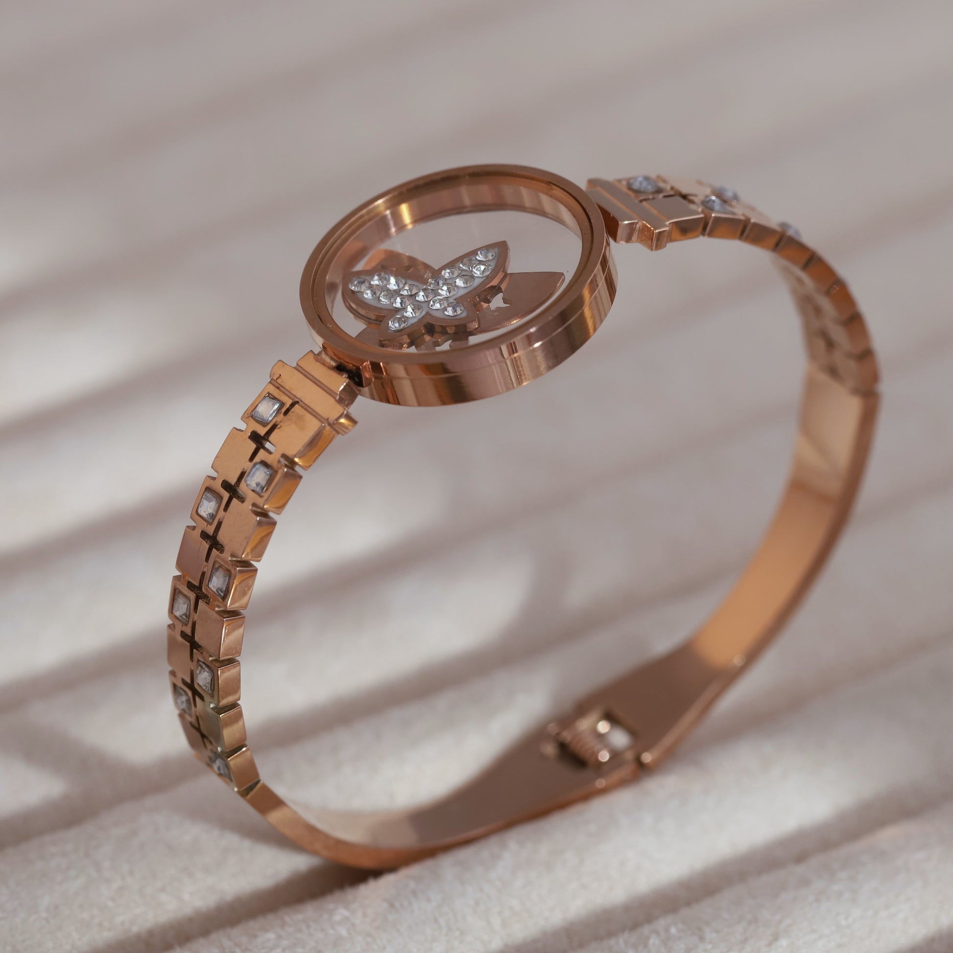The Velora Bracelet is a symbol of refined elegance, crafted in a radiant rose gold finish with a sleek watch-style design. Embellished with sparkling stones and intricate detailing, it radiates sophistication and luxury. Lightweight yet durable, this bracelet is the perfect statement accessory for parties, festive occasions, or everyday glamour. A timeless piece that enhances any outfit with effortless charm.