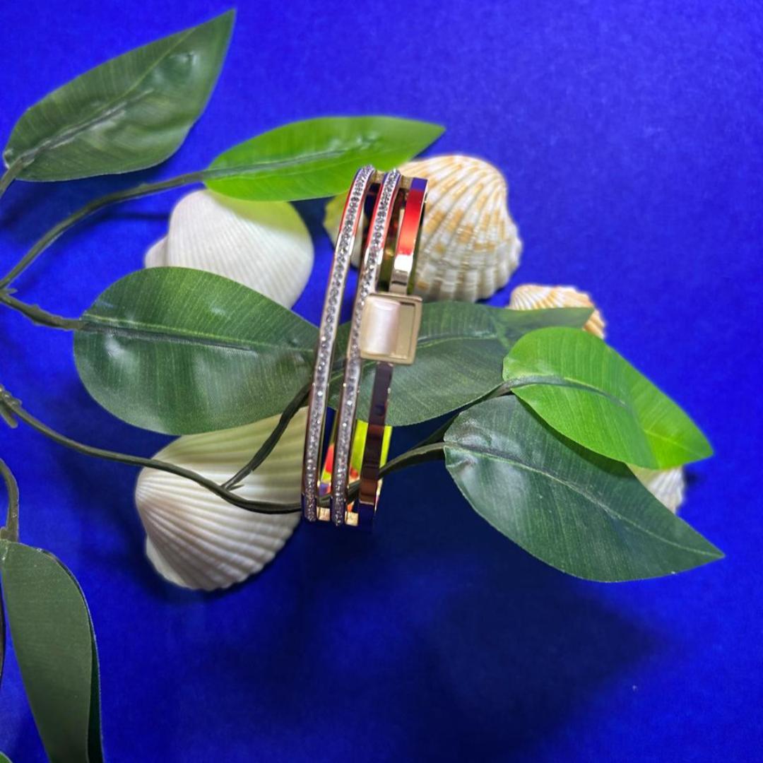 The design is anchored by a sophisticated, rectangular charm with a smooth, iridescent white or mother-of-pearl inlay, adding a touch of subtle elegance and a unique focal point. The clean lines and contrasting textures make this bracelet a versatile accessory for any occasion, whether you're looking to elevate your everyday style or add a final touch to a formal outfit. It's a chic and timeless piece that makes a wonderful gift for yourself or a loved one.