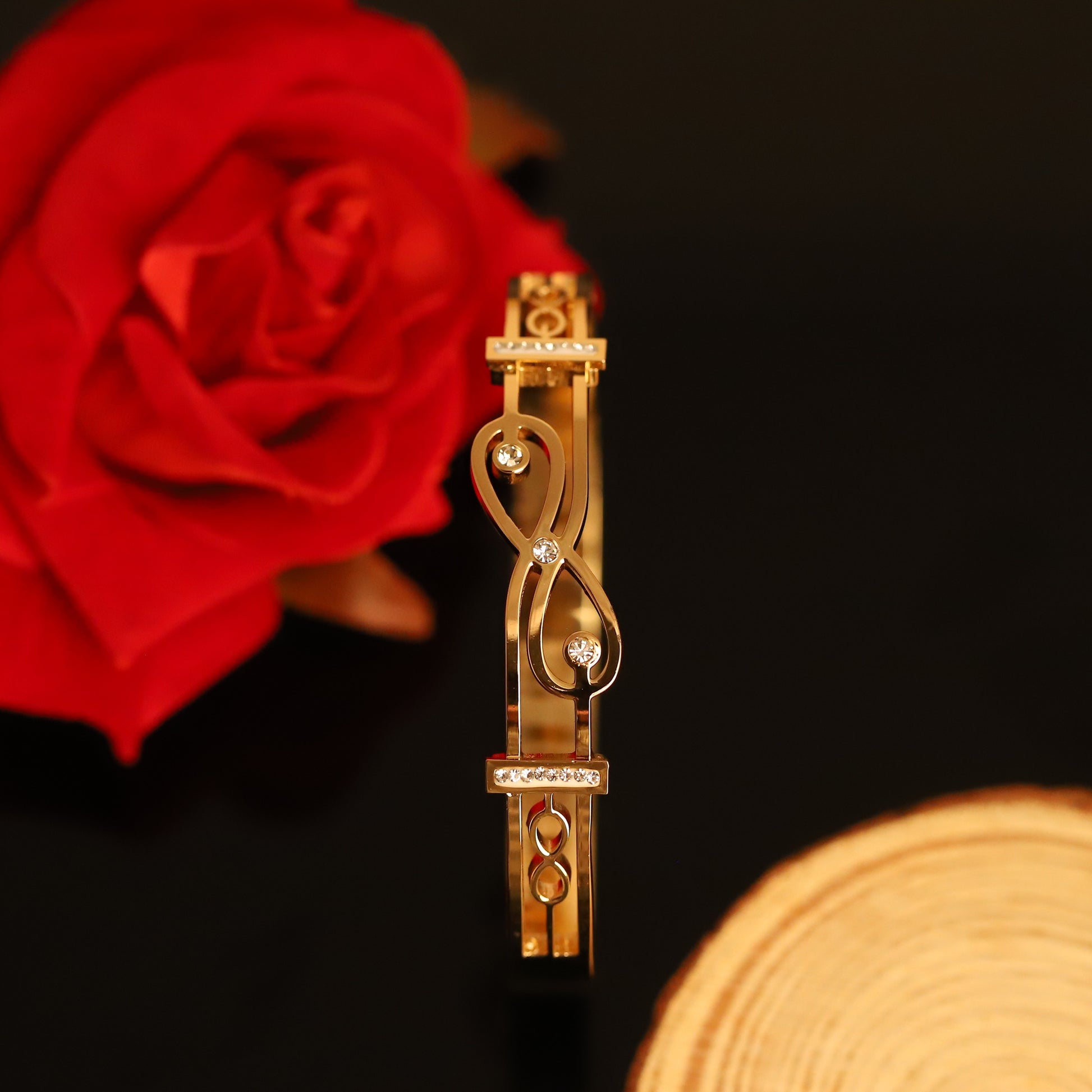 Elevate your style with this elegant and symbolic anti-tarnish gold-toned bracelet. Crafted with a sleek, polished finish, this piece features a captivating infinity loop design at its center, symbolizing eternal connection and timeless grace. The intertwining loops are accented with two brilliant, bezel-set cubic zirconia crystals that catch the light with every movement. The bracelet's band is a modern, open-cuff style, with one side gracefully curving into a secure closure. The top and bottom sections of the main design are adorned with sparkling pave-set crystals, adding a touch of luxurious shimmer. This piece is a perfect blend of modern design and classic symbolism, making it an ideal accessory for both everyday wear and special occasions. Its refined beauty and meaningful design, along with its anti-tarnish properties, make it a wonderful and lasting gift for yourself or a loved one.